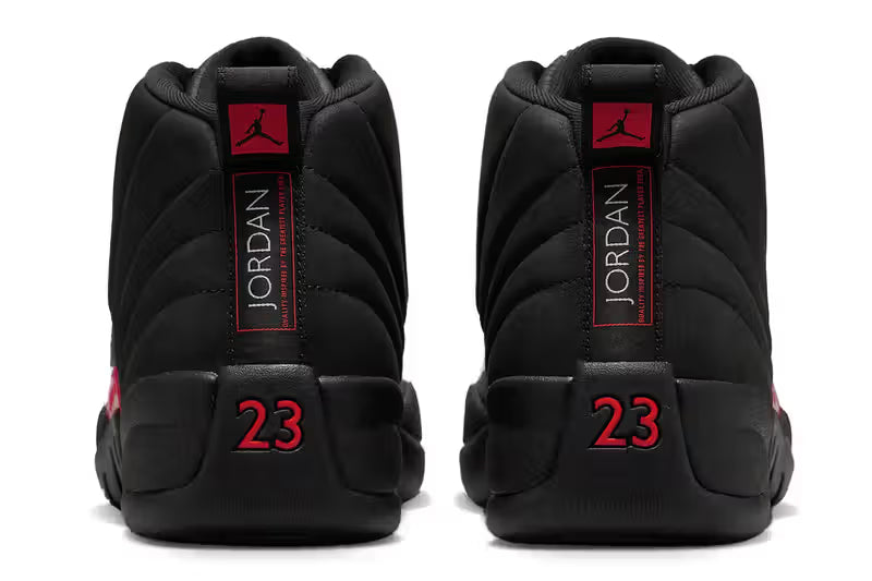 The Air Jordan 12 "Bloodline" is an upcoming sneaker expected to release on May 23, 2026 (or June 2026, based on varying reports), featuring a classic Black/Varsity Red colorway. It will retail for $205-$215 and features a black leather upper, lizard-textured mudguards, and bold red accents on the outsole, eyelets, and branding.