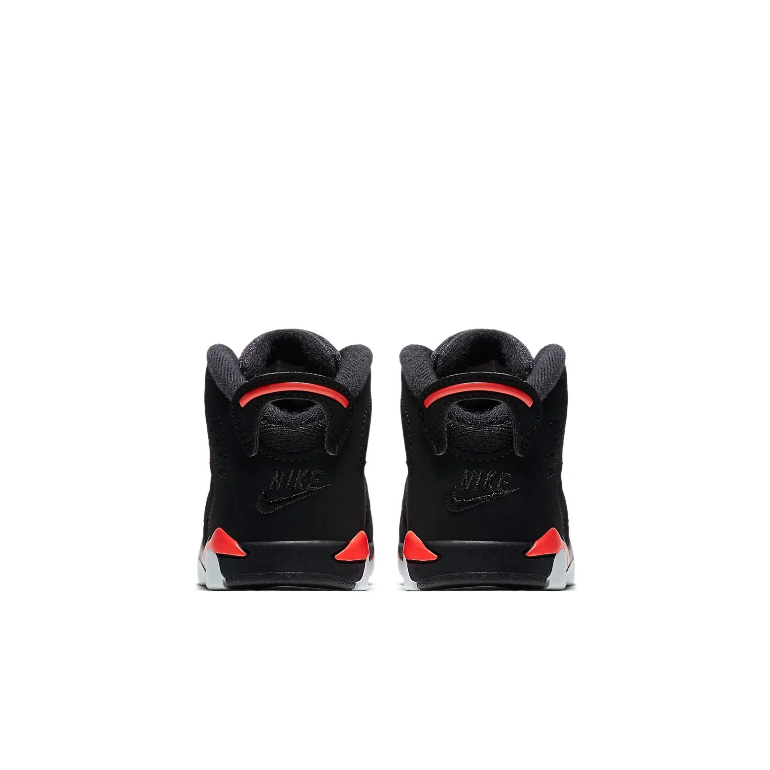 The Air Jordan 6 Retro TD 'Infrared' 2019 brings the signature look to toddler sizes. The shoe's black upper is built with perforated suede, accented by Infrared on the tongue and heel, matched by the signature midsole detailing. The outsole maintains the signature tread and detailing of its full-size counterparts.