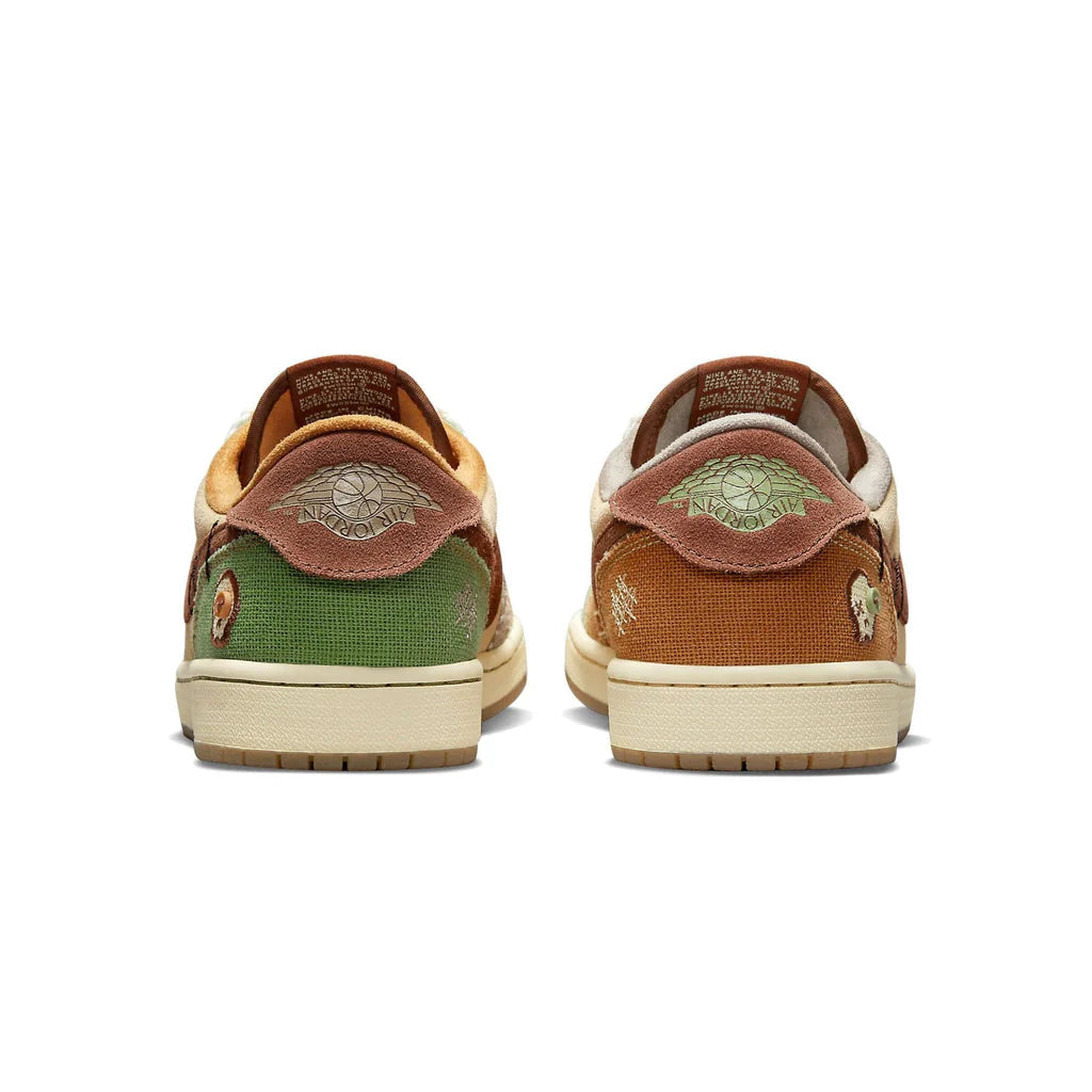 The Zion Williamson x Air Jordan 1 Retro Low OG ‘Voodoo’ shares a New Orleans-inspired theme with a companion Zion 2 colorway from June 2022. Braided rope laces secure the upper, featuring beige suede quarter panels and a brown suede toe box. Burlap-like overlays feature raw edges and mismatched color blocking in light brown, Oil Green and Fossil. In addition to exposed deco stitching, unique accents include an inverted mini-Swoosh on the forefoot and an embroidered voodoo-doll graphic on the lateral heel. An upside-down Wings logo is stamped on the brown suede heel tab, which lifts up to reveal mismatched ‘Voodoo’ and ‘Zion’ graphics on the interior side.